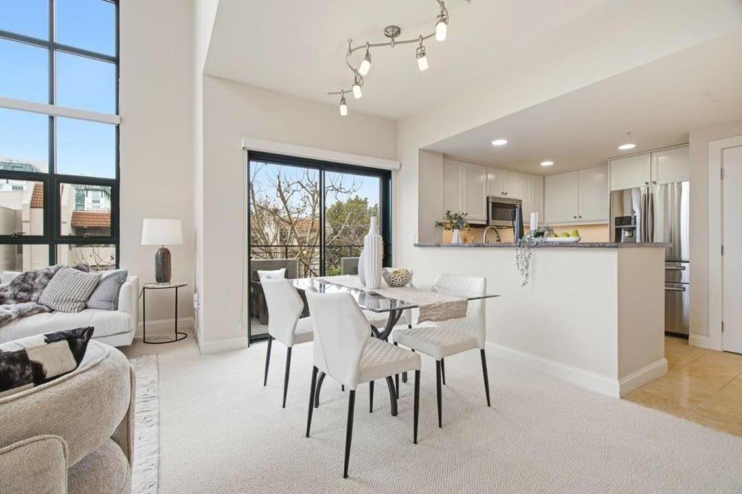 Set above the city in a premier top-floor corner setting, this exceptional townhouse-style condominium offers a rare combination of space, light, and privacy in the heart of downtown San Mateo. Soaring 19-foot ceilings and expansive floor-to-ceiling windows flood the living area with natural light and capture sweeping open views. Second-level loft provides the flexibility of a family room, home office, or potential third bedroom. Refined finishes include limestone and marble surfaces throughout, complemented by a well-appointed chefs kitchen with granite countertops and stainless steel appliances. The primary suite is a private retreat, with scenic views, a walk-in closet, and an elegant spa-like bathroom with marble-tiled shower, and separate soaking tub. Additional highlights include a gas fireplace, a dedicated in-unit laundry room with washer/dryer, central AC and heating, and three private balconies with views of the Bay and surrounding hills. Secure underground garage with 2 deeded parking spaces. Enjoy access to a modern fitness center and beautifully landscaped courtyards with fountains and cascading waterfalls. Ideally located just moments from Central Park, downtown shopping, dining, and Caltrain. This move-in-ready home offers both convenience and elevated living.